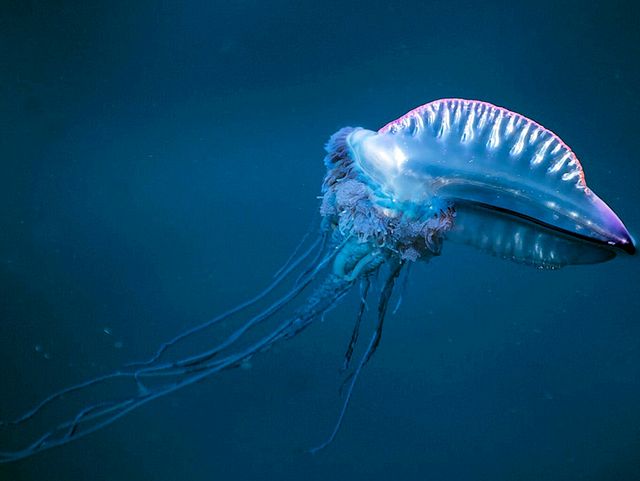 Морское животное с таким довольно романтичным названием «Португальский кораблик» на самом деле колония из медузоидных и полипоидных особей. Не будем умничать и сразу скажем что этот блестящий пузырь с щупальцами длина которых может достигать 50-ти метров оставил свой болезненный автограф на теле не одной сотни людей.