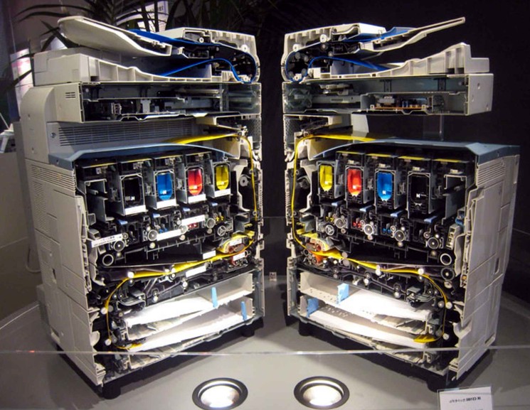 Цветной принтер в разрезе, очень хорошо видны четыре картриджа с краской CMYK.