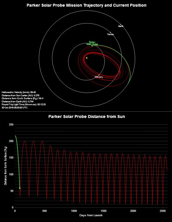 PSP пройдет свой первый перигелий 6 ноября. В этот день аппарат приблизится к поверхности Солнца на расстояние 24,1 млн км, а его гелиоцентрическая скорость составит 342 тыс. км/ч (95 км/c). В будущем, по мере выполнения гравитационных маневров в окрестностях Венеры, автоматический разведчик будет постепенно снижать перигелий своей орбиты, соответственно увеличивая максимально возможную скорость.