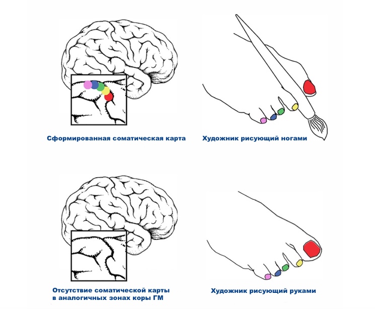 Специалисты предположили, что врожденная способность формировать “карты” есть у каждого человека. Если нет рук, используются пальцы ног, и в мозге создается “схема”. У обычных людей нет необходимости работать ногами, нет опыта, поэтому в коре головного мозга такая карта для ног не строится. Но при необходимости мозг делает это, и тогда ноги заменяют руки.