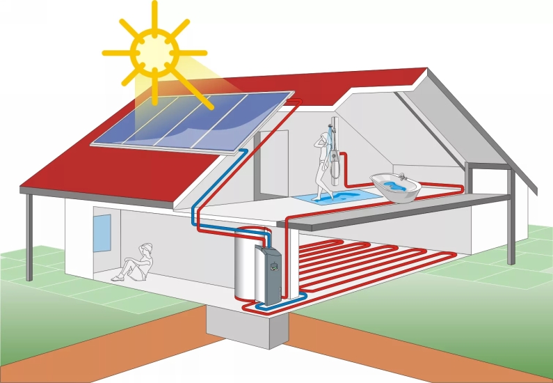 Однако обычные системы меньше используют солнечную энергию для отопления в холодное время года. В основном они нагревают питьевую воду и зависят от дополнительного отопления. Например, возможны системы газового отопления, котлы на пеллетах или тепловые насосы, которые обеспечивают достаточное количество тепла даже в пасмурные дни.