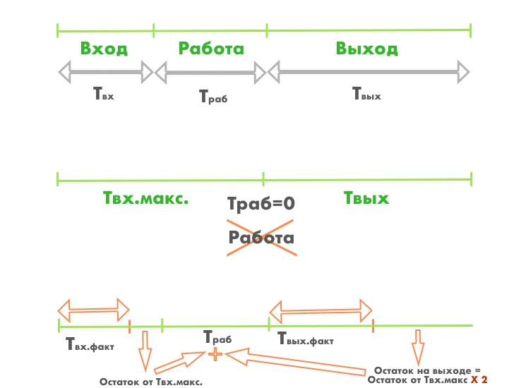 - Tобщ — общее время работы в аппарате (вход + работа + выход).