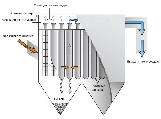 Принцип работы рукавных фильтров заключается в том, что загрязненный воздух проходит через рукава, где твердые частицы и другие загрязнения остаются на поверхности рукавов, а чистый воздух выходит наружу. Для улучшения эффективности фильтрации могут применяться различные материалы для рукавов, такие как текстиль, синтетические материалы, армированные рукава из стекловолокна или тефлона.