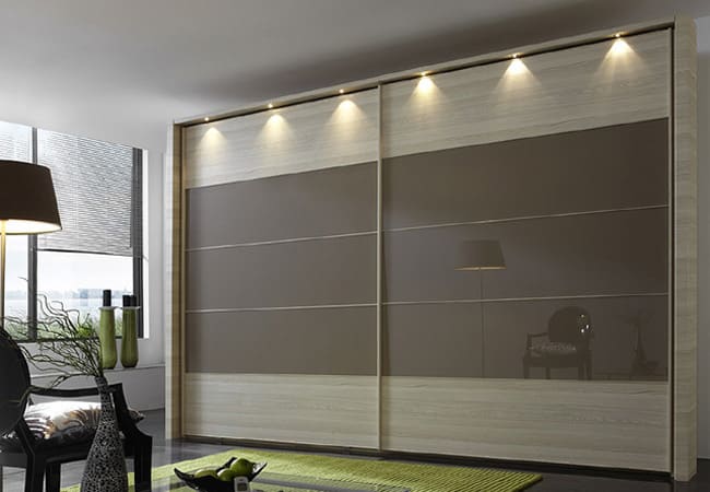Начинаем с секции шкафа. Она состоит из двух стоек и трёх полок между ними. Эта конструкция соединяется эксцентриковыми стяжками. Левая секция имеет ширину 490 мм, а правая — 400. Так получается выступ для крепления планки упора раздвижных дверей. Остальные три полки крепим к стойкам фиксирующими полкодержателями.