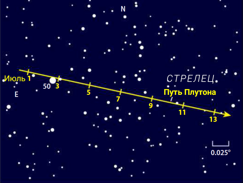 В ночь со 2 на 3 июля владельцы больших телескопов могут попробовать отыскать карликовую планету Плутон, который как раз будет проходить рядом со сравнительно яркой (6m) звездой 50 Стрельца. В определенный момент угловое расстояние между ними составит всего несколько угловых секунд. Блеск Плутона не превысит 14-й звездной величины, поэтому для его наблюдений нужен телескоп с диаметром объектива не менее 250 мм и чистое незасвеченное ночное небо. Также до конца месяца можно наблюдать за движением среди звезд яркого астероида Весты (4 Vesta).