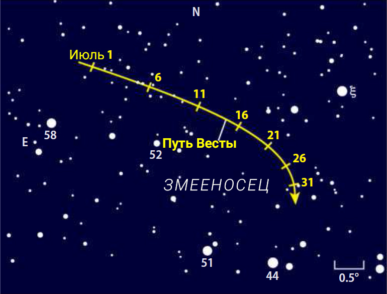 Самый яркий астероид Главного пояса Веста в июле продолжает оставаться легкой целью для наблюдателей, двигаясь в юго-западном направлении по южной части созвездия Змееносца.