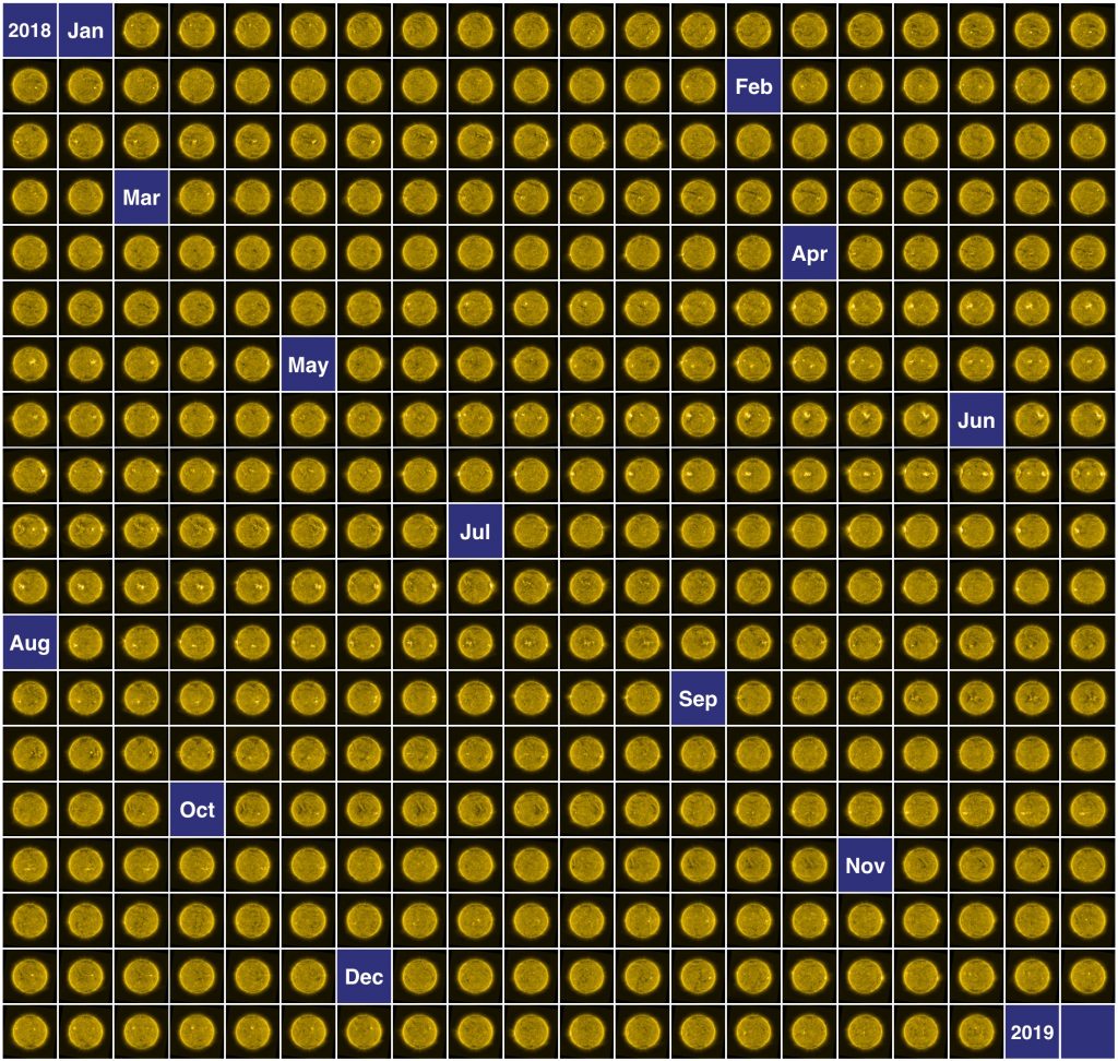 Коллаж из 365 изображений Солнца, сделанных спутником Proba-2 в 2018 г. ESA/Royal Observatory of Belgium