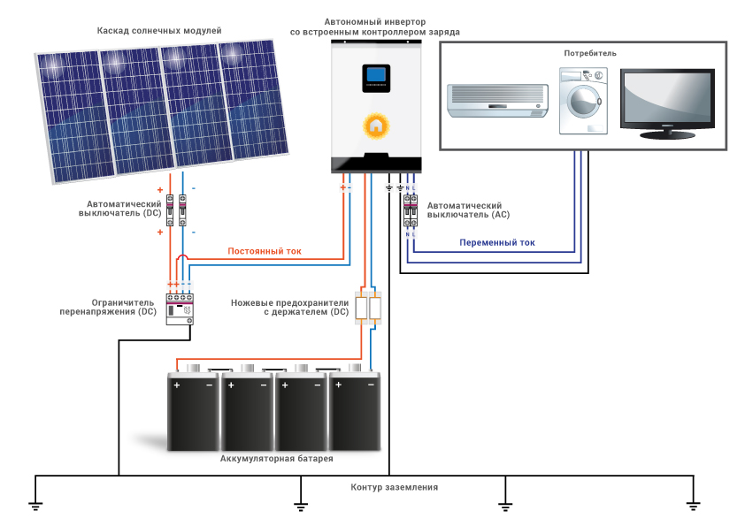 Инверторы — это устройства, преобразующие постоянный ток (Постоянное напряжение) от солнечных батарей в переменный ток (Переменное напряжение), используемый в электрических сетях дома.