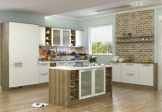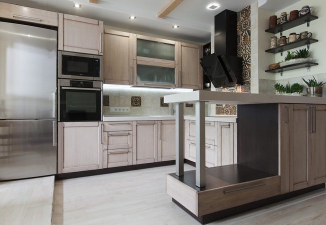 Современные материалы позволяют выбрать абсолютно любые цвета, начиная от классических древесных до металлика и глянца. Самыми распространенными материалами для фасадов кухни являются: МДФ в пленке, ПВХ и акриловые фасады. Что касается фурнитуры, то сейчас представлен просто огромный выбор, поэтому при работе с дизайнером обращайте внимание на все детали.