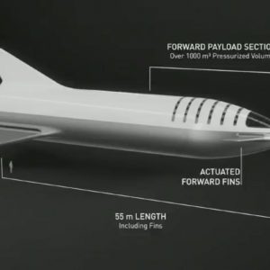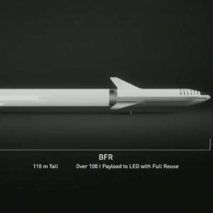 Во время церемонии Илон Маск также официально представил обновленный дизайн BFR. Новая версия получила увеличенную пассажирскую кабину и модифицированные хвостовые стабилизаторы, в которые интегрированы посадочные опоры. Корабль получит семь двигателей Raptor, аналогичных тем, что будут использованы на первой ступени ракеты. По словам Маска, это сделано с целью ускорения проекта и минимизации рисков. В будущем корабль BFR может быть оснащен специальной версией Raptor с увеличенным соплом, предназначенной для работы в вакууме.