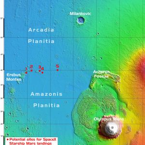 В общей сложности было опубликовано семь снимков, на которых запечатлены шесть возможных мест посадки SpaceX. Пять из них расположены на стыке Амазонии и Аркадии (Amazonis Planitia, Arcadia Planitia) — равнинных участков в умеренных широтах северного полушария Марса. Собранные автоматическими аппаратами данные указываются на то, что здесь имеются погребенные под слоем грунта ледники. Они могли бы стать источником топлива для двигателей Starship, а также воды и кислорода для их экипажей. Все выбранные участки отличаются плоским рельефом, имеют достаточно места для строительства поселения и расположены в низинах, где атмосферное давление выше. А это значит, что люди будут получать несколько меньшие дозы облучения космической радиацией, чем при посадке в высокогорных регионах.