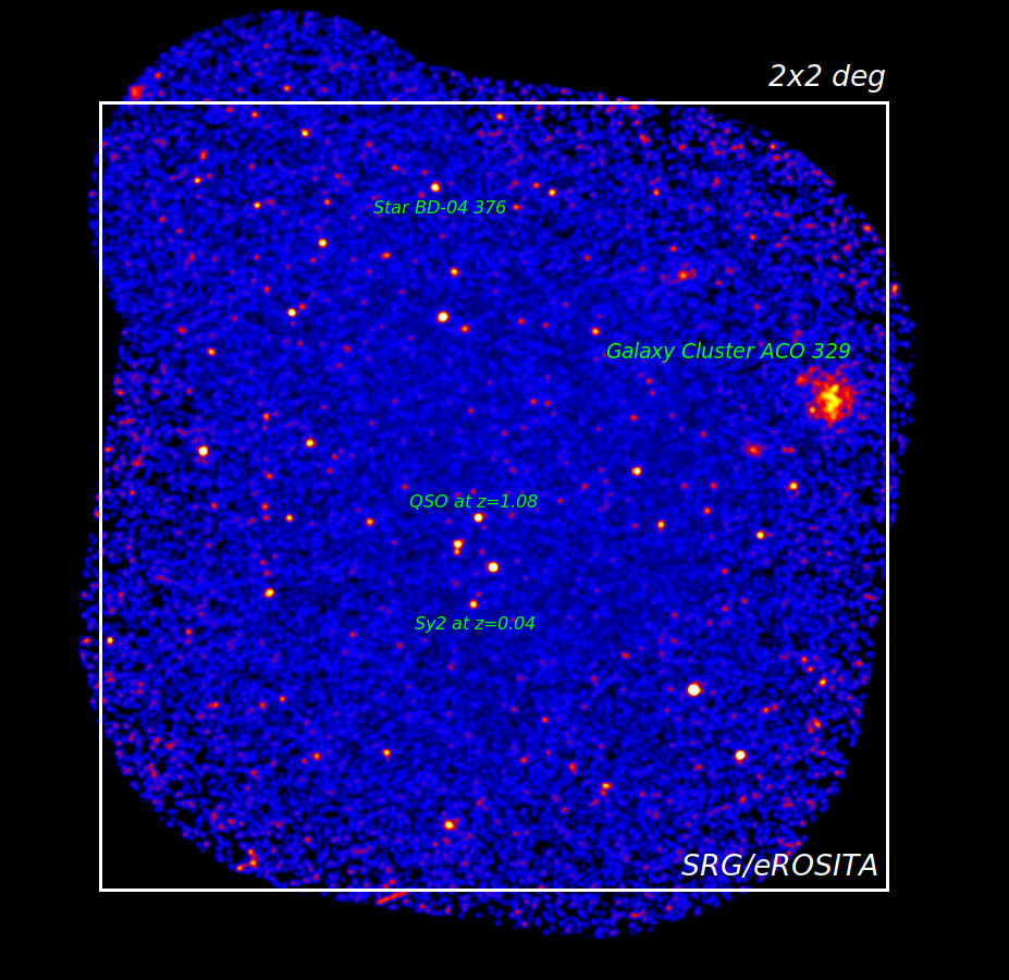 На борту «Спектр-РГ» имеется еще один рентгеновский телескоп — немецкий eROSITA. Недавно он также приступил к наблюдениям, получив изображение внегалактического неба. Центральная часть отснятого поля размером 1×1° известна астрофизикам как UDS (Ultra Deep Survey — зона Сверхглубокого обзора).