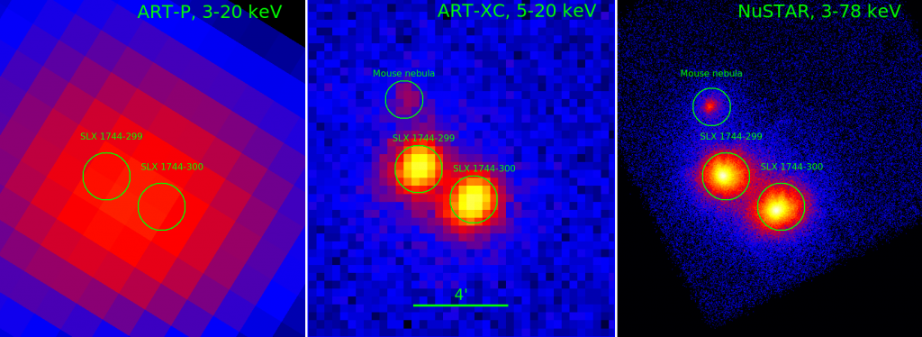 На приведенном коллаже показаны три снимка SLX 1744-299 и SLX 1744-300, сделанных запущенной в 1989 г. обсерваторией «Гранат», а также телескопами «Спектр-РГ» и NuSTAR. Угловое расстояние между рентгеновскими источниками составляет 2,6 минуты. «Гранат» осуществлял съемку в диапазоне от 3 до 20 кэВ с разрешением до 5 минут дуги, которого не хватило, чтобы рассмотреть источники по отдельности. Установленный на борту «Спектр-РГ» телескоп ART-XC имеет гораздо более совершенную оптическую систему, позволяющую снимать в диапазоне от 5 до 20 кэВ с разрешением около 30 угловых секунд — этого достаточно, чтобы увидеть оба источника. Наконец, для наглядности приведен снимок NuSTAR. Его диапазон простирается от 3 до 78 кэВ, а разрешение достигает 18 секунд дуги. В то же время поле зрения ART-XC составляет 36 угловых минут, в то время как у обсерватории NuSTAR этот показатель в семь раз меньше.