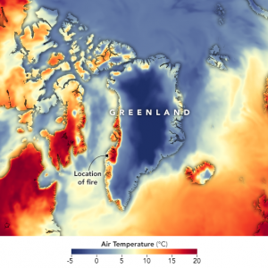 10 июля в западной части острова Гренландия неподалеку от города Сисимут вспыхнул крупный пожар. Он был сфотографирован спутником Landsat 8. Полученный снимок вскоре был опубликован на сайте NASA Earth Observatory. Изображение является комбинированным. Цвета поверхности острова, дыма и облаков соответствуют естественным, в то время как огонь добавлен по результатам инфракрасных наблюдений.