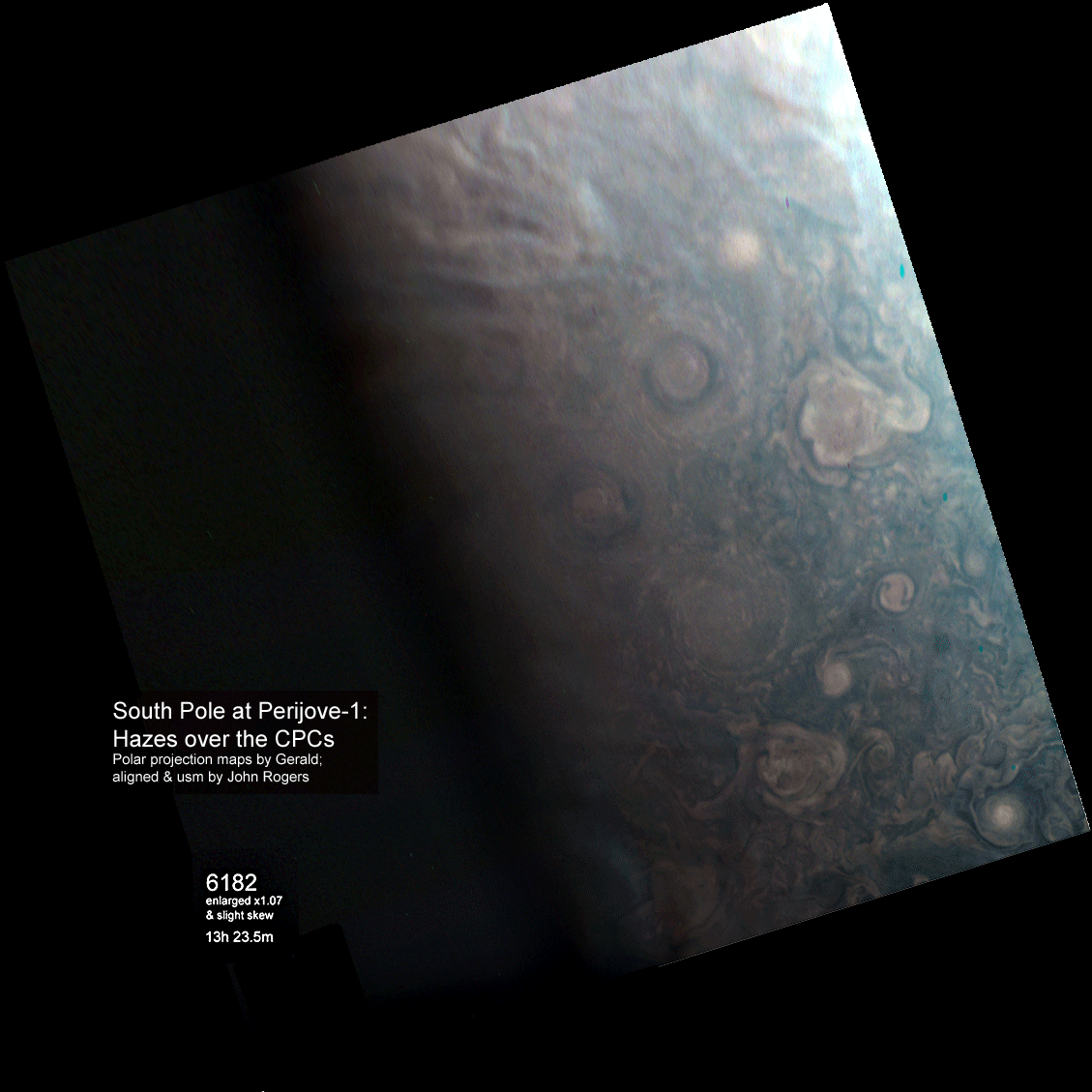 Еще одна удивительная находка связана с полюсами Юпитера. При помощи инструмента JIRAM (Jovian Infrared Auroral Mapper) Juno получил инфракрасные изображения атмосферных образований, находящихся на 50-70 км ниже границы облачного покрова. Оказалось, что на северном полюсе газового гиганта доминирует центральный циклон, окруженный восемью меньшими циклонами диаметрами от 4000 до 4600 км. Вместе они образуют фигуру, напоминающую восьмиугольник. На южном полюсе тоже имеется доминирующий центральный циклон. Вокруг него расположено пять вихрей диаметром от 5600 до 7000 км, образующих пентагональную фигуру.