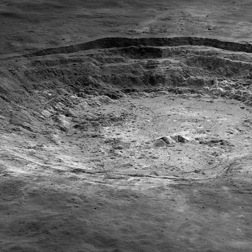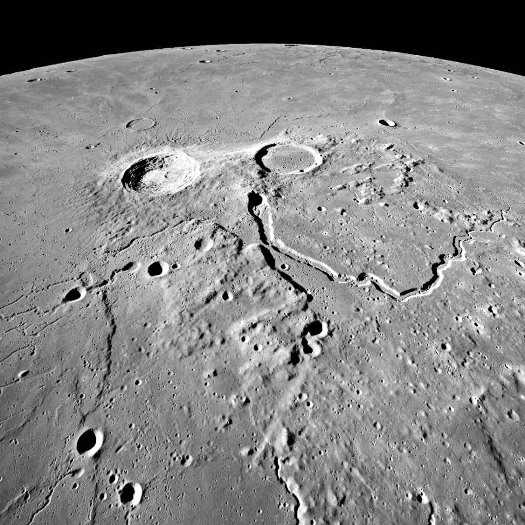 На этом снимке аппарата LRO запечатлено самое яркое образование на Луне — 40-километровый кратер Аристарха. Его альбедо превышает альбедо большинства лунных формаций в два раза, что позволяет заметить его даже невооруженным глазом.