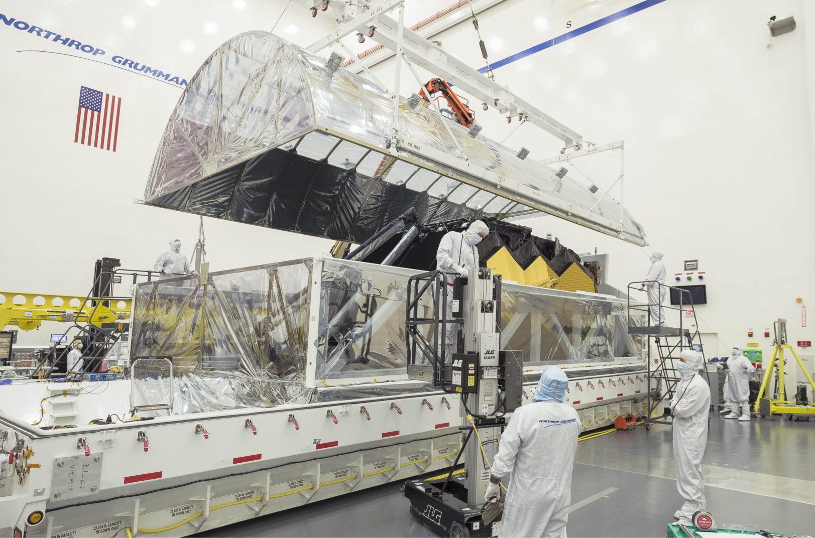 8 марта космический телескоп Джеймса Уэбба (James Webb Space Telescope — JWST) прошел важную веху. Впервые в истории проекта все его основные компоненты (зеркало, приборы, теплозащитный экран) оказались собраны в одном помещении. Оно находится на предприятии Northrop Grumman в Калифорнии. Это последний пункт назначения телескопа перед его отправкой на космодром Куру во Французской Гвиане. Оттуда он будет запущен ракетой Ariane 5 в точк