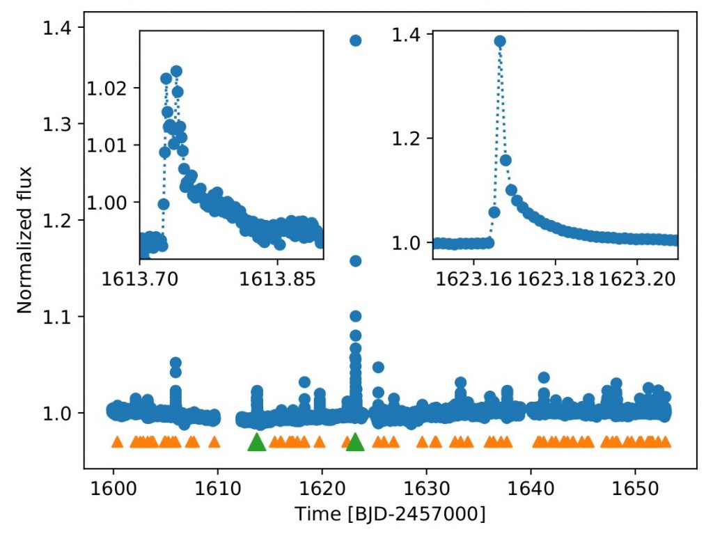 Результаты наблюдений TESS за Проксимой Центавра. Желтые треугольники обозначают зафиксированные телескопом вспышки, зеленые — две самые мощные вспышки. Источник: Krisztián Vida (Konkoly Obs.)