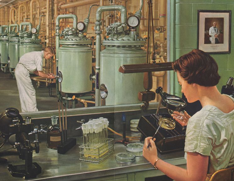 - Открытие пенициллина. Плесневый гриб Penicillium notatum, попадая к культуре бактерий, вызывает полную их гибель – это было доказано Александром Флеммингом. В 40-х годах был разработана производственная технология пенициллина, который в дальнейшем стал выпускаться в промышленном масштабе.