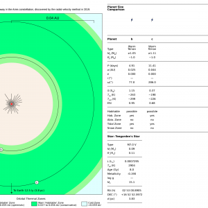 По словам астрономов, массы экзопланет как минимум на 10% превышают массу Земли. Их периоды обращения составляют 4,91 и 11,4 дней, а орбиты проходят на расстоянии соответственно 0,025 а.е. (3,7 млн км) и 0,044 а.е. (6,6 млн км) от центрального светила. Но, несмотря на столь небольшую по меркам Солнечной системы удаленность от своей звезды, в теории на поверхности экзопланет может существовать вода в жидком виде.