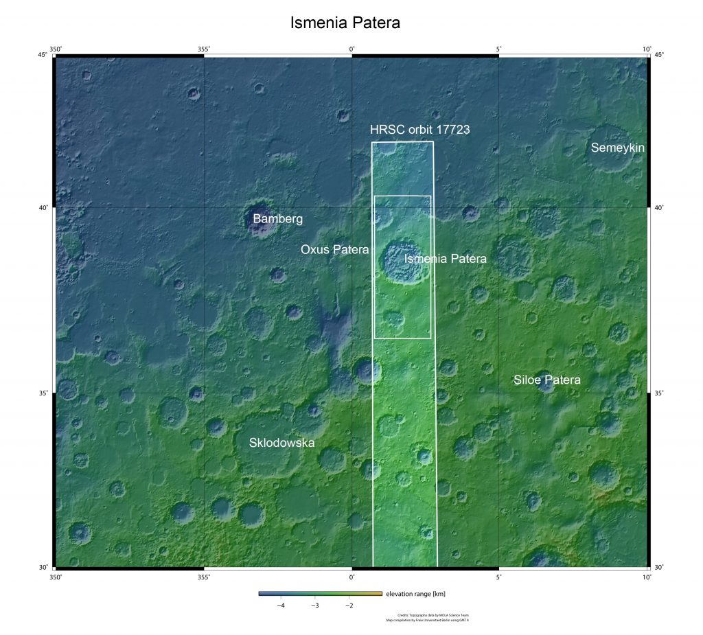 На представленных изображениях аппарата Mars Express запечатлен кратер Ismenia Patera. В переводе с латинского, это название означает «плоская чаша».