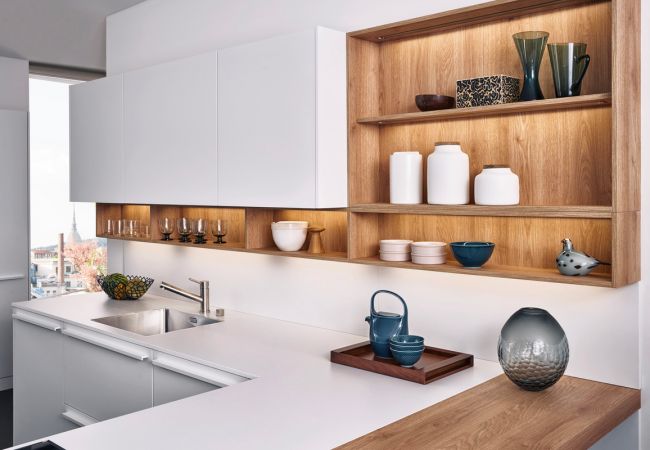 При изготовлении кухонной мебели на заказ производитель всегда учитывает все пожелания заказчика. Подбирается подходящий цвет и форма для мебельных фасадов, гармоничная фурнитура, форма отделений и секций кухонных шкафов, общая конфигурация обустраиваемой кухни.