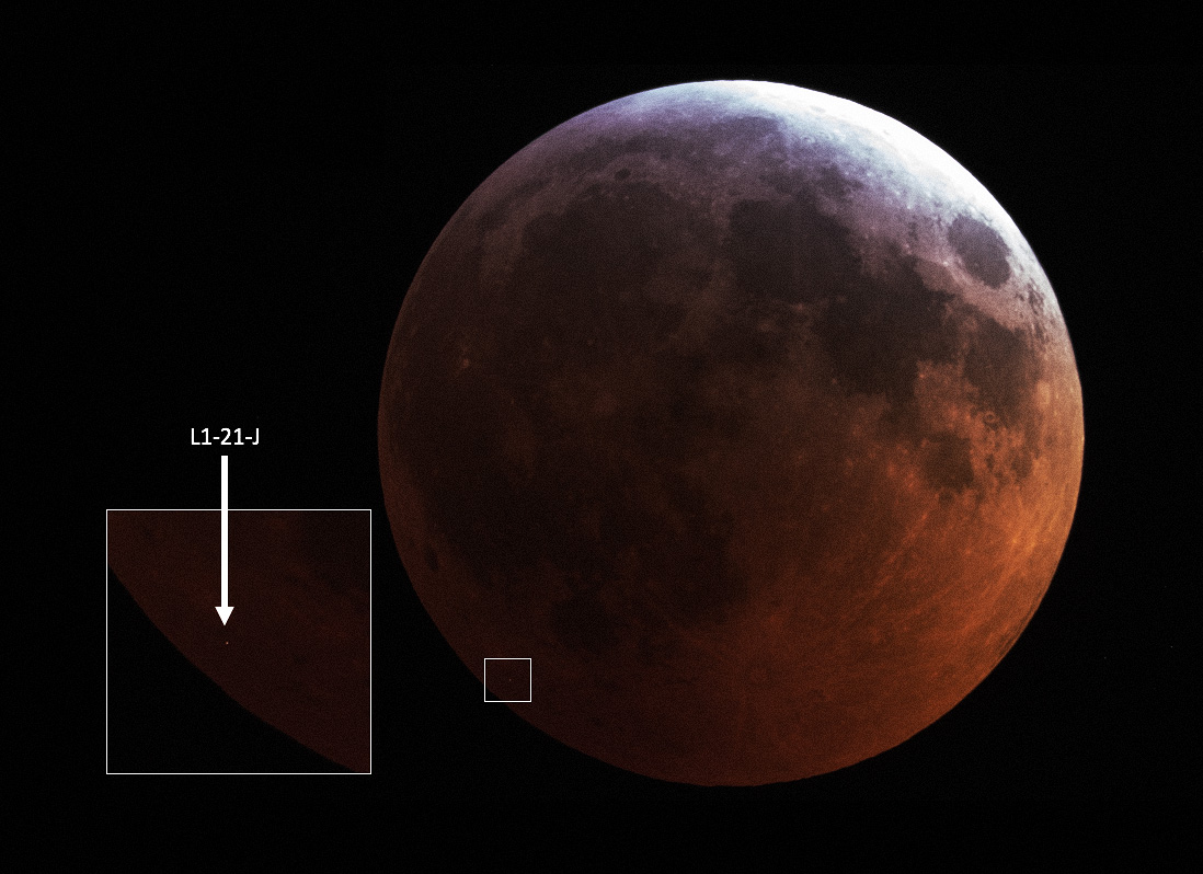 Вспышка от падения на Луну метеорита, произошедшего во время полного затмения 21 января 2019 г. Источник: Fritz Pichardo in Santo Domingo