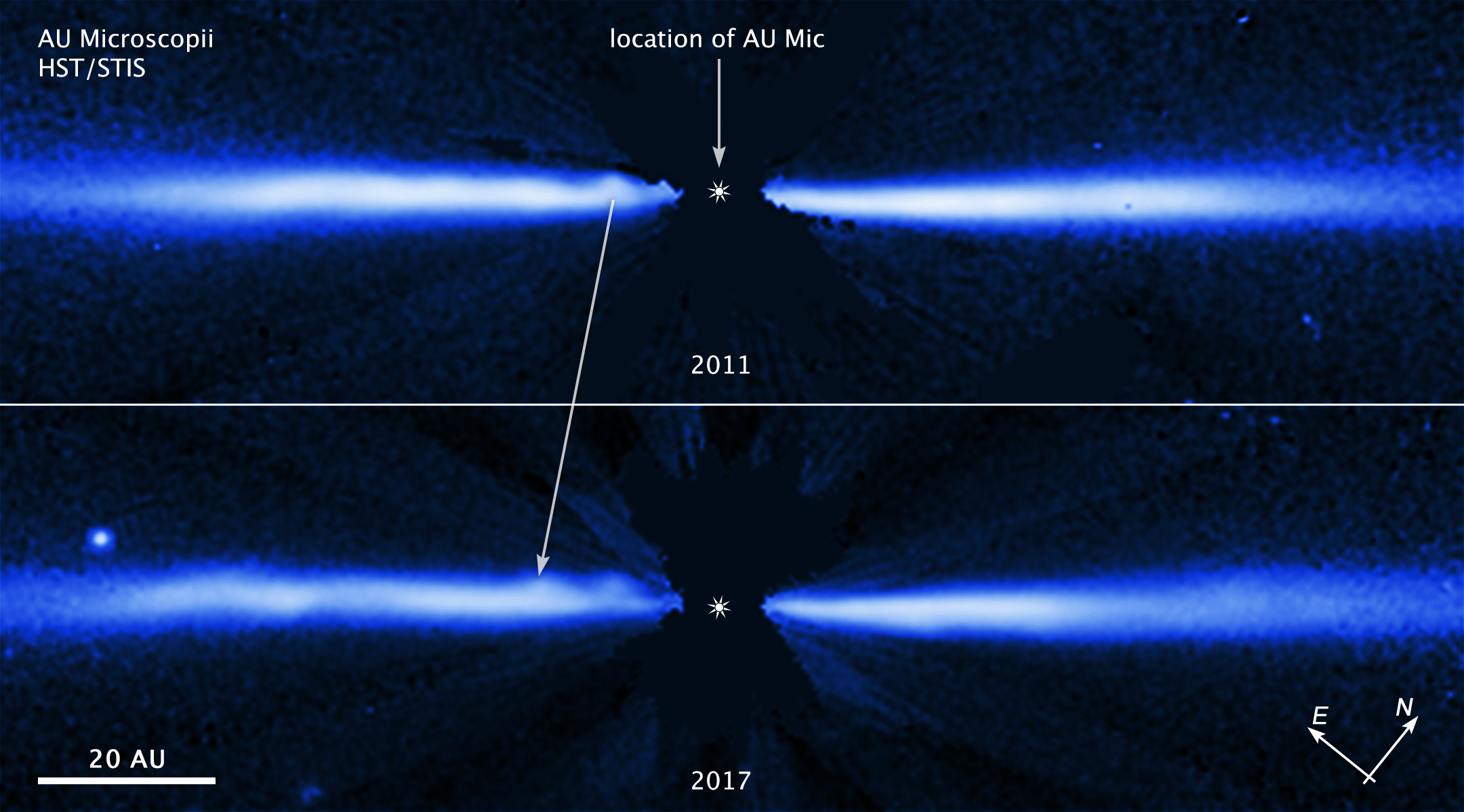 Два снимка осколочного диска вокруг молодого красного карлика AU Mic, полученные космическим телескопом Hubble с интервалом в 6 лет. Они показывают смещение одного из быстродвижущихся от звезды облаков, выталкивающее материал прочь из системы. Источник: NASA, ESA, J. Wisniewski (University of Oklahoma), C. Grady (Eureka Scientific), and G. Schneider (Steward Observatory)