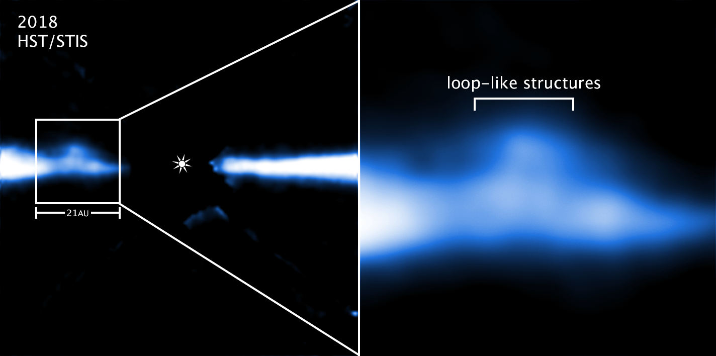 В ходе недавних наблюдений телескопу Hubble удалось обнаружить в этом диске шесть удаляющихся от звезды облаков вещества, чьи диаметры сопоставимы с расстоянием между Солнцем и Юпитером. Они движутся со скоростями от 15 тыс. до 43 тыс. км/ч и находятся на расстоянии от 1,5 млрд до 8,9 млрд км от центрального светила.