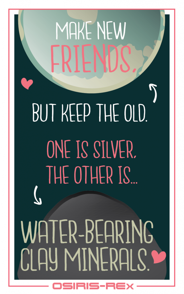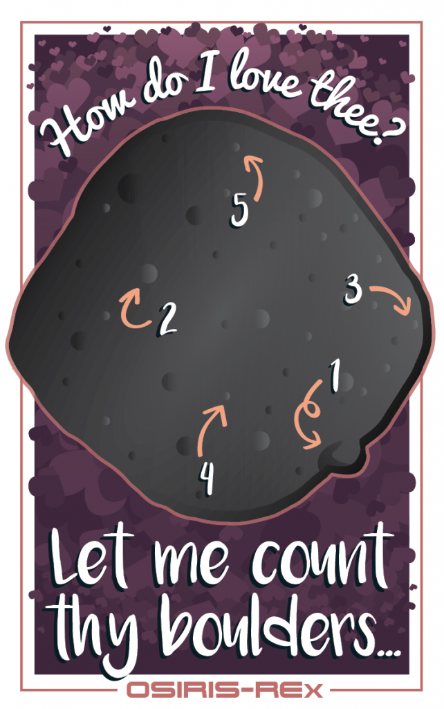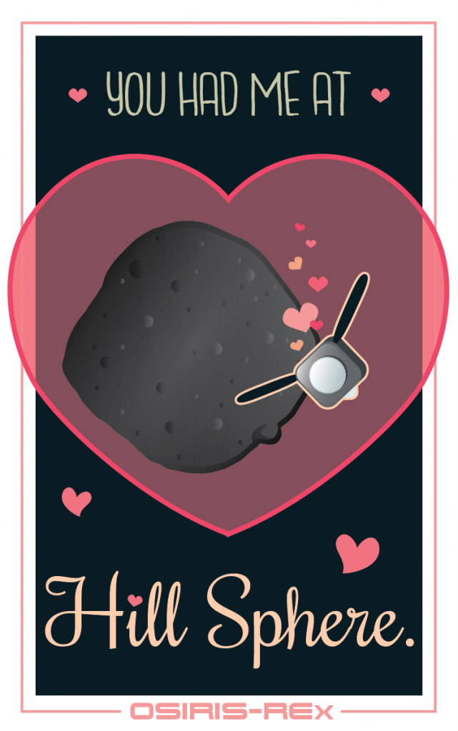 У миссии OSIRIS-REx есть одна весьма интересная традиция. Ежегодно перед днем святого Валентина группа сопровождения выкладывает подборку постеров, посвященных этому празднику. 2019-й год не стал исключением. В преддверии 14 февраля на официальном сайте миссии была опубликована новая серия изображений, обыгрывающих в романтическом стиле различные ее аспекты — от особенностей поверхности астероида Бенну до термина «сфера Хилла» (пространство вокруг объ