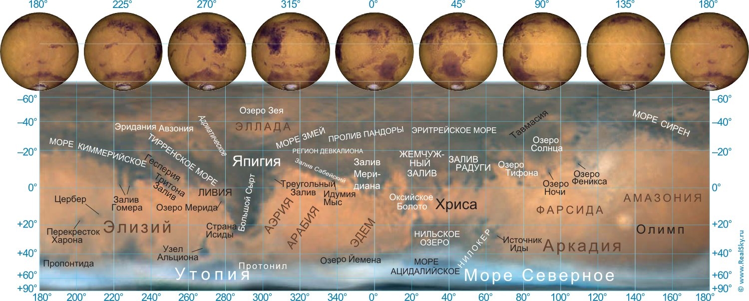 Основные детали марсианской поверхности, видимые в достаточно мощные любительские инструменты. Источник: Sky & Telescope