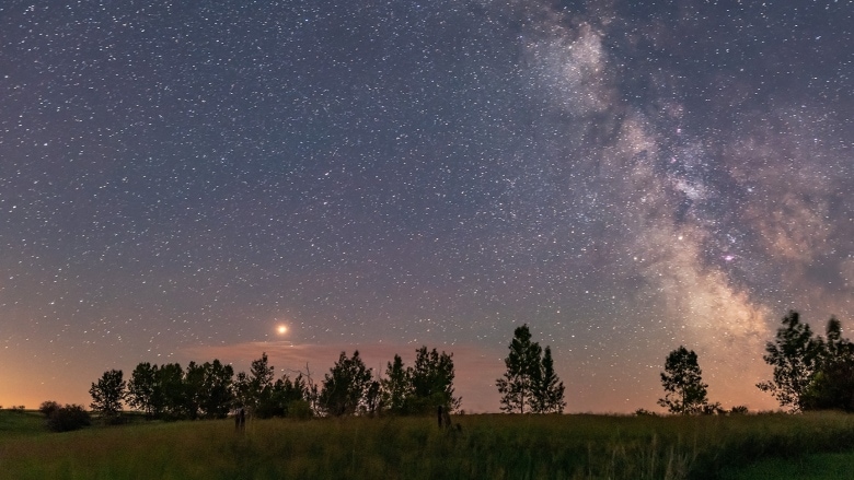 Марс на ночном небе (яркая красная точка у горизонта), Источник: Alan Dyer/AmazingSky.co