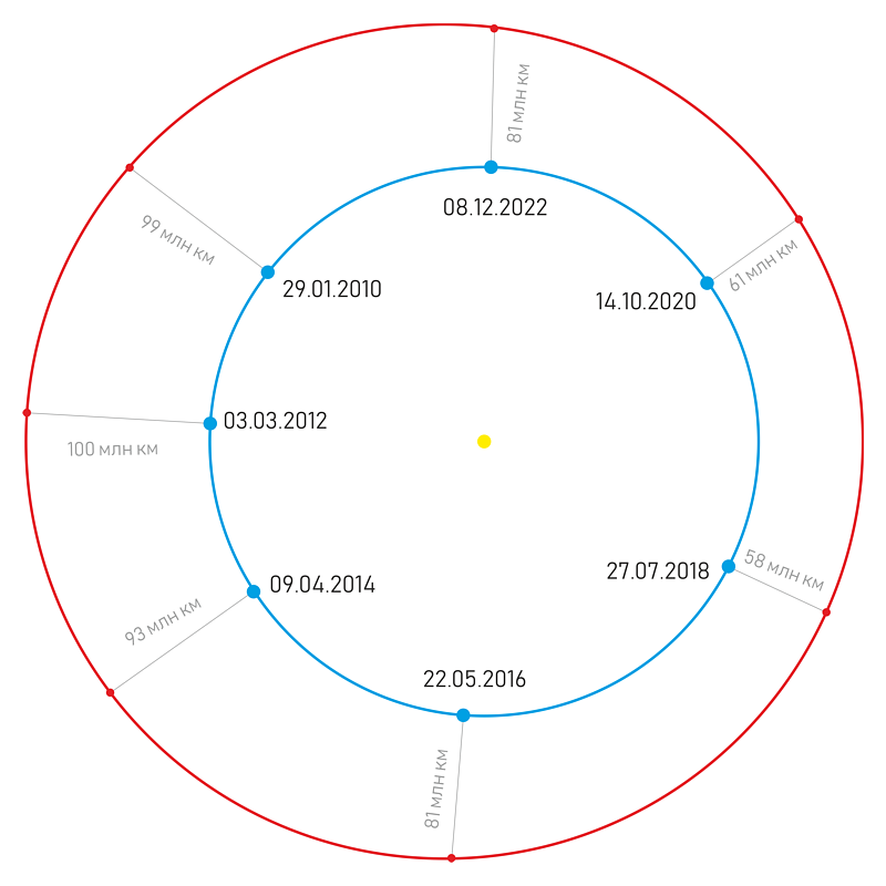 Сближения Марса с Землей в период с 2010 по 2022 гг. Источник: habr.com