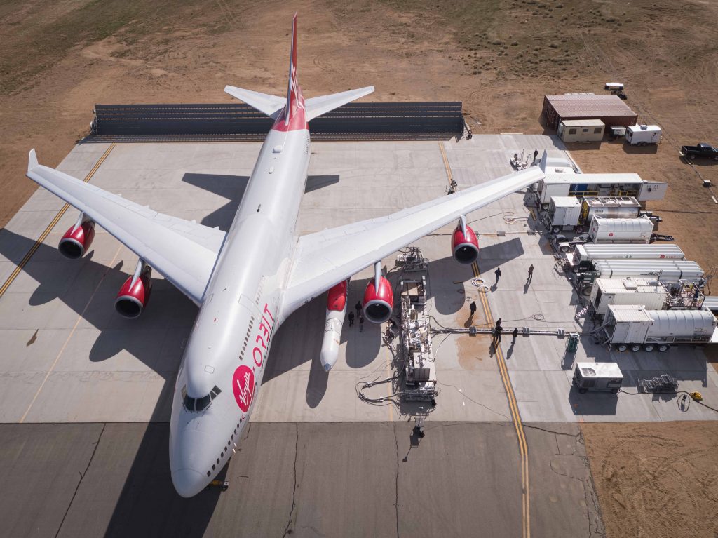 Вдобавок Virgin Orbit опубликовала новые фотографии самолета-носителя Cosmic Girl (переоборудованный Boeng 747) с прикрепленной ракетой в окружении вспомогательного оборудования. Снимки были сделаны на ВПП аэрокосмического центра Мохаве.