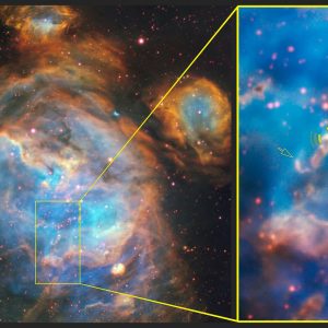 Особенность формы N180B состоит в том, что эта туманность образует циклопический водородный пузырь, окруженный четырьмя пузырями меньшего размера. Глубоко в недрах этого светящегося облака MUSE обнаружил джет (т.н. объект Хербига-Аро), выброшенный только что образовавшимся светилом, масса которого превосходит солнечную в 12 раз. Протяженность структуры, получившей обозначение HH 1177, составляет почти 33 световых года — она является одним из самых длинных звездных джетов, известных астрономам.