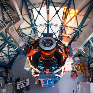 В центре фотографии можно увидеть «сердце» VST — 268-мегапиксельную камеру OmegaCAM, нацеленную на ночное небо. Она помещена в термостабилизированный контейнер с пультом управления. Оптическая система телескопа состоит из двух зеркал: главного диаметром 265 см и вторичного диаметром 93,8 см.