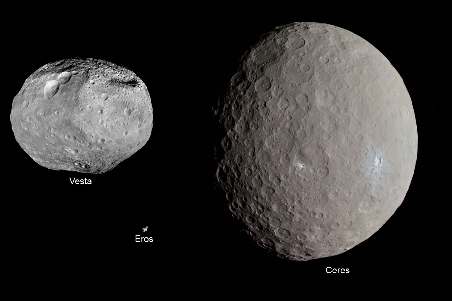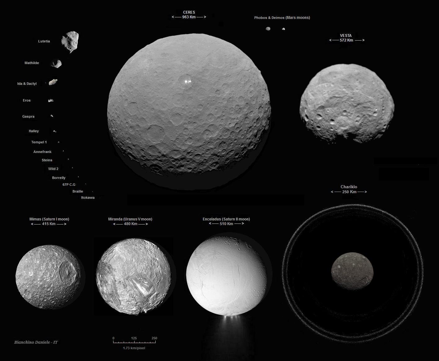 Стоит отметить, что на представленном выше изображении нет двух крупнейших объектов Главного пояса астероидов Цереры и Веста, изучавшихся с орбиты аппаратом Dawn. Согласно нынешней классификации МАС, Церера считается карликовой планетой. Что касается Весты, то ее также часто называют протопланетой, уцелевшей с момента формирования Солнечной системы. Следующие инфографики демонстрирует сравнительные размеры Цереры, Весты, а также некоторых астероидов и объектов Солнечной системы.