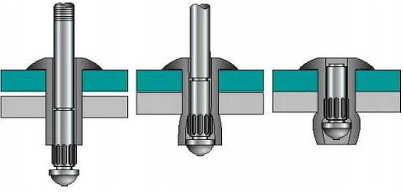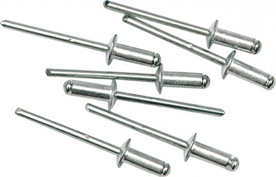 Заклепки служат для крепления двух деталей методом склепывания. Крепление происходит за счет деформации металла. Широкое применение в последнее время находят отрывные заклепки. Это стержень со стальной или алюминиевой втулкой и шариком на конце. Существует специальное приспособление для установки таких заклепок, которое надевается на штырь. Благодаря ему шарик входит внутрь втулки и раздвигает ее. При обычном усилии, шарик отрывается, штырь выходит, таким образом, соединение расклепывается.