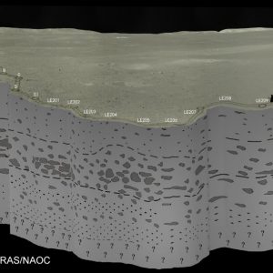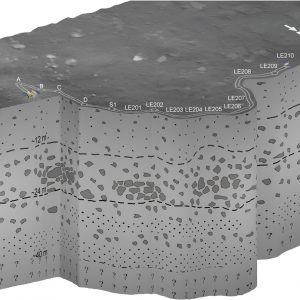 Ниже находится слой приблизительно такой же толщины (10-12 м), состоящий из валунов различного размера. По мнению ученых, они появились при падениях метеоритов, образовавших крупные кратеры в этом регионе. Их удары размололи часть камней, что объясняет большую толщину поверхностного слоя мелкозернистого реголита.