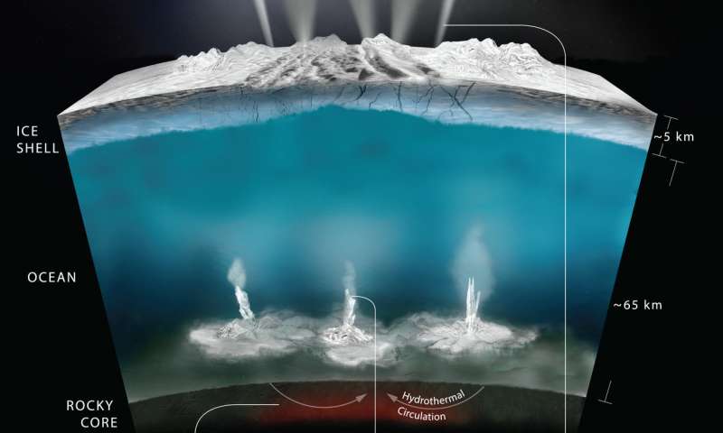 Схема предполагаемого строения океана Энцелада. Источник: NASA/JPL-Caltech/Southwest Research Institute