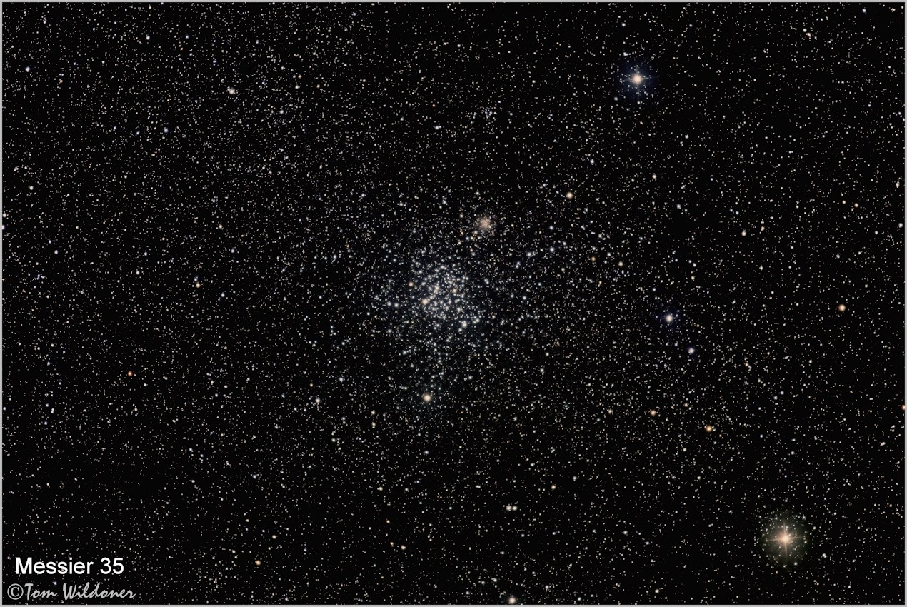 Рассеянное скопление M35, сфотографированное американским любителем астрономии Томом Вилдонером (Tom Wildoner). Красноватая туманность выше и немного правее — скопление NGC 2158. Источник: Tom Wildoner