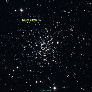 В телескопы с диаметром объектива 75-100 мм вблизи юго-западного края M35 видно небольшое слабое туманное пятнышко — рассеянное скопление NGC 2158 (8,6m). Оно расположено от нас в шесть раз дальше (почти на окраине Галактики) и содержит несколько сотен звезд. Самые яркие из них имеют блеск всего 13m. В 250-миллиметровый рефлектор при увеличении 200 крат скопление напоминает тлеющую золу, в которой вспыхивают отдельные искорки, и лишь при увеличении диаметра телескопа еще вдвое становится видимой его основная часть. NGC 2158 относят к довольно редкому классу объектов, промежуточных между шаровыми и рассеянными скоплениями.