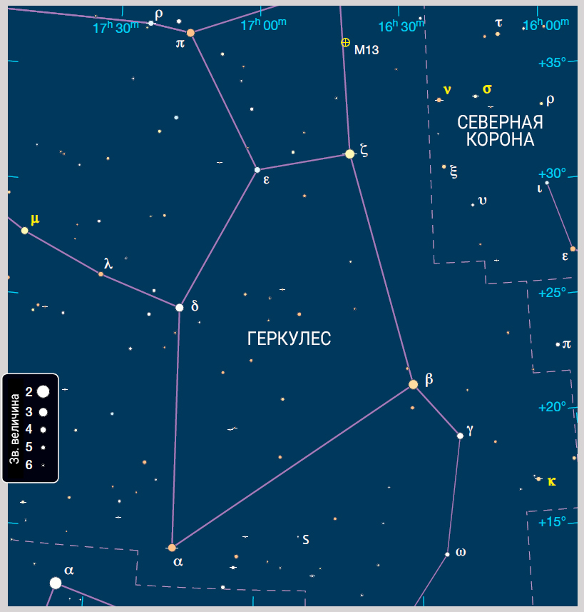 К западу от Северной Короны расположена небольшая трапеция с цепочками зрение, отходящие от каждого угла — опрокинутый «вверх ногами» герой Геркулес. Самая яркая звезда этого созвездия Рас-Альгети является кратной, к тому же переменной (2,7-4m). По оценкам астрономов, этот красный гигант по размерам в 400 раз превышает наше Солнце! В Геркулесе находится апекс Солнца — точка, куда движется вся наша Солнечная система со скоростью около 20 км / с относительно соседних звезд. Однако визитной карточкой созвездия является его яркие шаровые звездные скопления M13 и M92. Первое из них имеет видимый блеск 5,7m и считается самым ярким подобным объектом северного полушария неба. И неудивительно — в темную ночь его даже можно рассмотреть невооруженным глазом. Угловой размер скопления — около 20´, что соответствует диаметру не менее 170 световых лет. От нас его отделяют 22 тыс. световых лет. M13 доступно почти для любого инструмента, но лучше смотреть его в телескопы диаметром более 200 мм — тогда оно превращается в бриллиантовую россыпь из оранжевых звезд 12-13-й величины (хотя отдельные звезды на его краях можно увидеть даже со 100-миллиметровым телескопом).