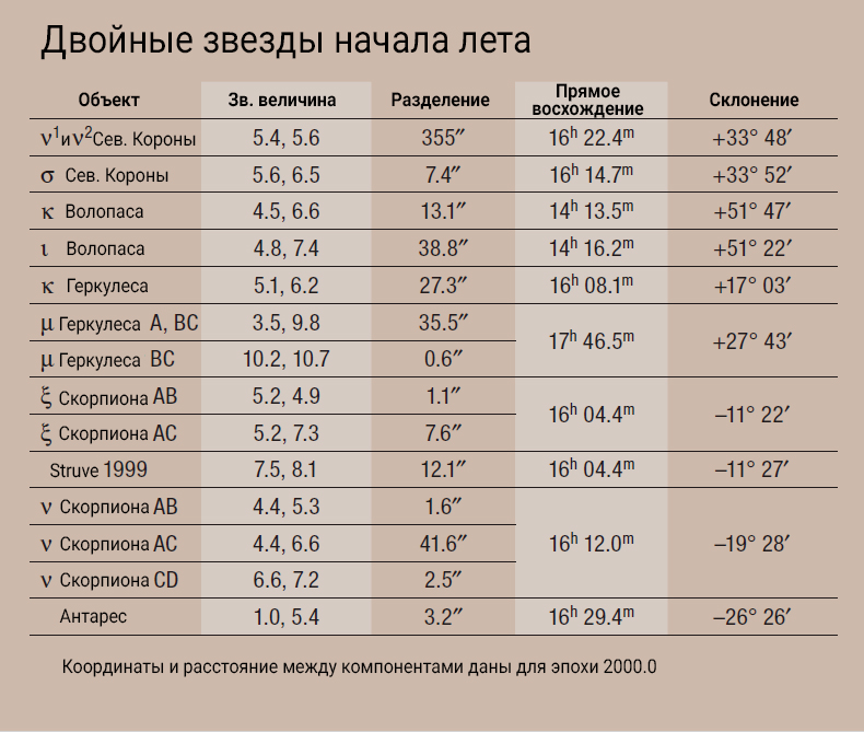 Короткими июньскими ночами вблизи зенита кульминируют созвездия Волопаса, Северной Короны и Геркулеса. Все эти названия пришли к нам из глубокой древности. Так, по древним представлениям Волопас выпасал семь небесных волов, которых олицетворяли звезды Большой Медведицы. Самая яркая звезда этого созвездия Арктур (-0,05m) — оранжевый гигант, по размерам в 22 раза превышающий Солнце. В 1635 Арктур стал первой звездой, которую французскому астроному Жану-Батисту Морену (Jean-Baptiste Morin) удалось увидеть в светлое время суток с помощью телескопа. Через 80 лет выдающийся английский астроном Эдмунд Галлей (Edmund Halley) благодаря сравнению тогдашних координат Арктура с координатами каталога Птолемея (II в. н.э.) обнаружил его смещение в направлении созвездия Девы. Сейчас величина этого смещения оценивается в 2,3 угловой секунды в год, поэтому проследить его можно даже любительскими средствами.