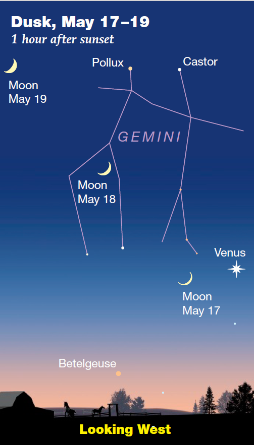 Положение Луны на небе 17-19 мая. Источник: Sky&Telescope 5/2018