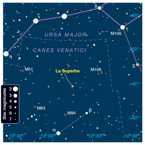 Наконец, из объектов, относящихся к нашему Млечному Пути, в этой части неба видна интересная переменная звезда Y Гончих Псов (La Superba), которая удалена от нас на расстояние 710 световых лет и является одной из самых привлекательных подобных звезд, видимых невооруженным глазом. Она относится к классу полуправильных переменных (SRb): в максимуме блеска ее яркость составляет 4,8m, а в минимуме — около 6,3m. Колеблется она с периодом примерно 160 суток.