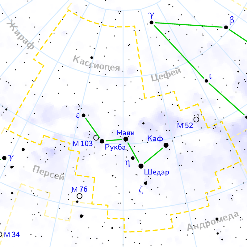 Созвездие Кассиопеи знаменито своими рассеянными скоплениями: современные звездные атласы приводят в этой сравнительно небольшой области неба до 90 объектов этого типа. Здесь же нередко происходили вспышки сверхновых звезд — последнюю из них наблюдал Тихо Браге (Tycho Brahe) в ноябре 1572 г.