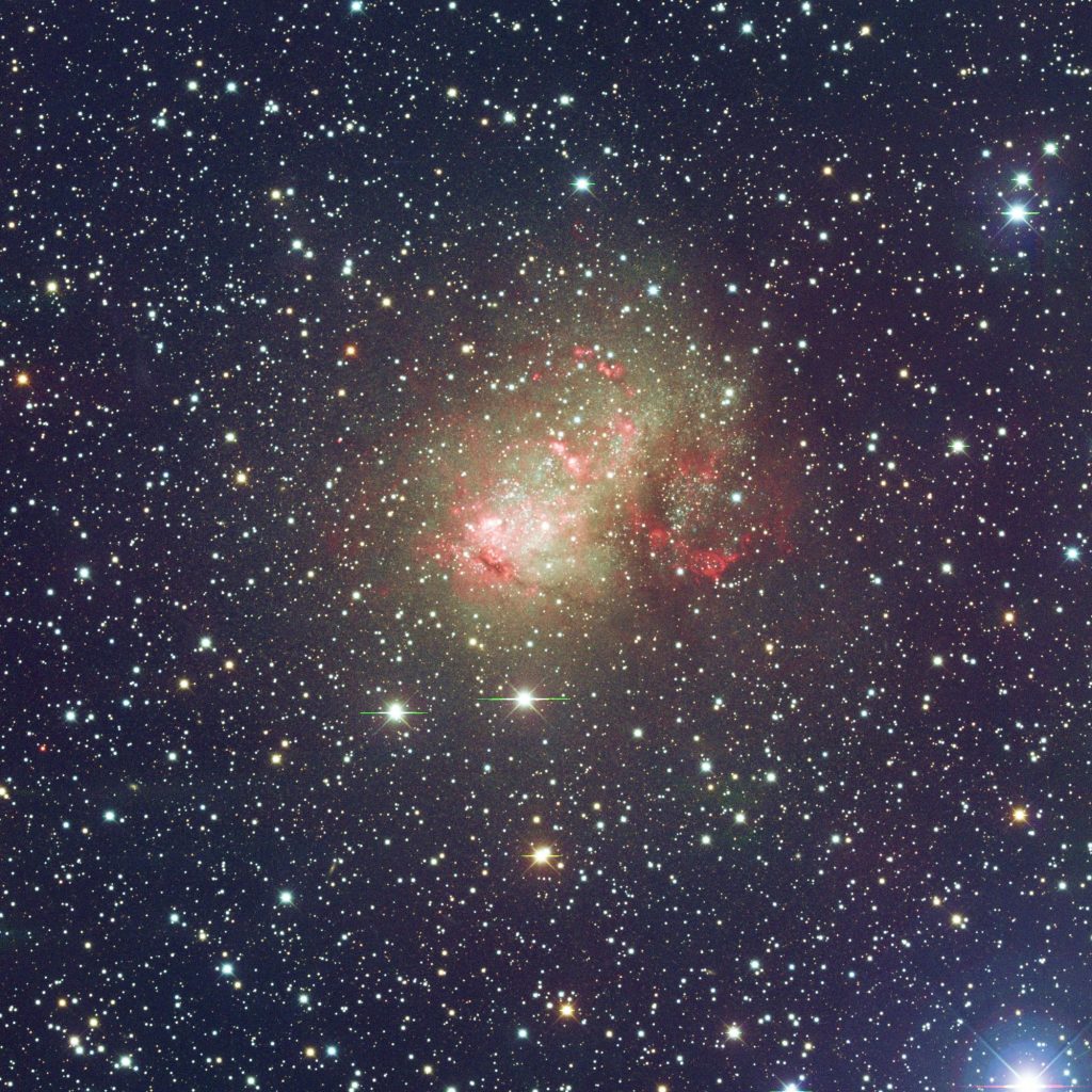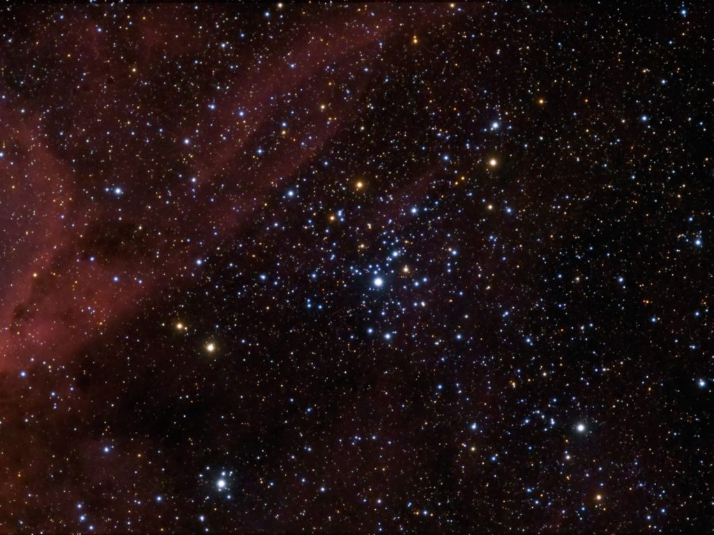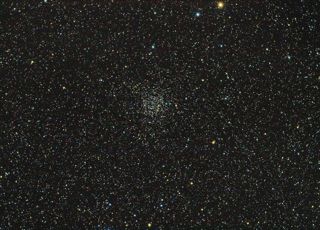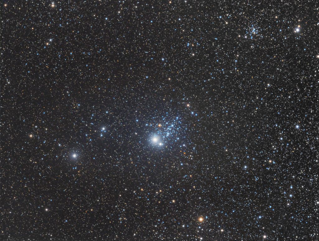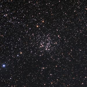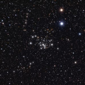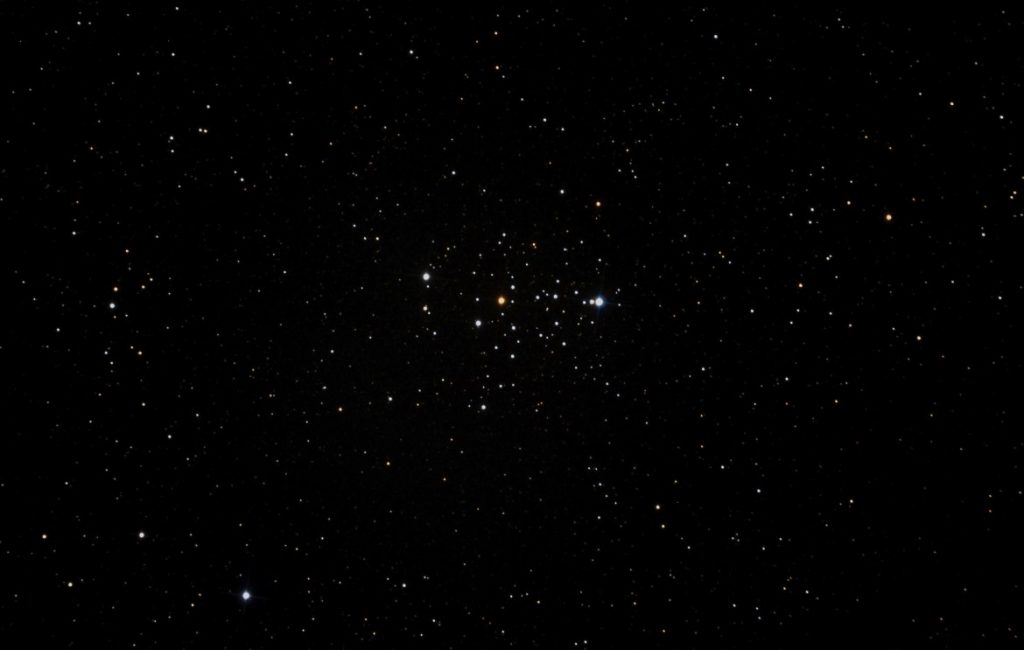 В поле зрения бинокля или небольшого телескопа здесь видно несколько слабых звезд и довольно яркое диффузное свечение фона. В телескоп с апертурой 200-250 мм скопление разрешается на сотню светил различной яркости. Прежде всего в глаза бросается яркая (8,6m) оранжевая звезда на западной границе скопления. При внимательном изучении можно заметить, что она четырехкратная, с тремя спутниками (примерно 11m) на расстояниях 44 угловых секунд к югу, в 80″ к северу и в 130″ к северо-востоку. «Скелет» рисунка скопления составляют примерно два десятка желтоватых звезд на фоне огромного множества более тусклых.