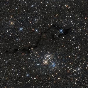 Неподалеку от звезды δ (дельта) Кассиопеи находится компактное скопление M103 (7,4m). Оно является самым удаленным рассеянным скоплением в каталоге Мессье: расстояние до него оценивается в 8000-9200 световых лет. Увидеть его можно с помощью небольшого телескопа или бинокля. 150-миллиметровый инструмент продемонстрирует компактную группу примерно из 20 звезд ярче 12m, имеющую форму указательной стрелки. В центре боковым зрением будет заметно смутное свечение остальных членов скопления. 250-миллиметровый рефлектор покажет уже около 30 светил, а полуметровый — не менее 70. В 3° северо-западнее M103 находится рассеянное скопление NGC 381 (9,2m), состоящее из слабых звезд.