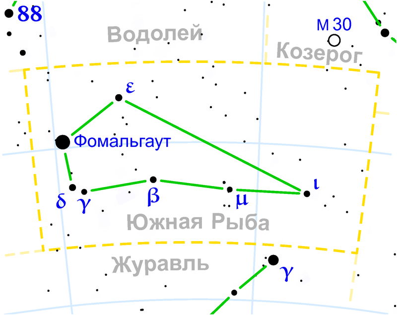 Чуть выше и восточнее находится созвездие Водолея, также относящееся к зодиакальным и не содержащее звезд ярче 3-й величины. Однако их большое количество действительно напоминает поток воды. Это одно из древнейших созвездий, изображающее человека, который льет воду из сосуда. Его звезды α и β (альфа и бета) называются соответственно Садалмелик и Садалсууд, что в переводе означает «счастье государства» и «счастье счастий». Они выглядят близнецами, имея практически одинаковый блеск (2,96 и 2,91m) и желтый цвет, удалены от нас почти на одно и то же расстояние, и вдобавок вокруг каждой из них обращается слабый звездоподобный спутник. Кроме того, они движутся в пространстве примерно с одинаковыми скоростями.